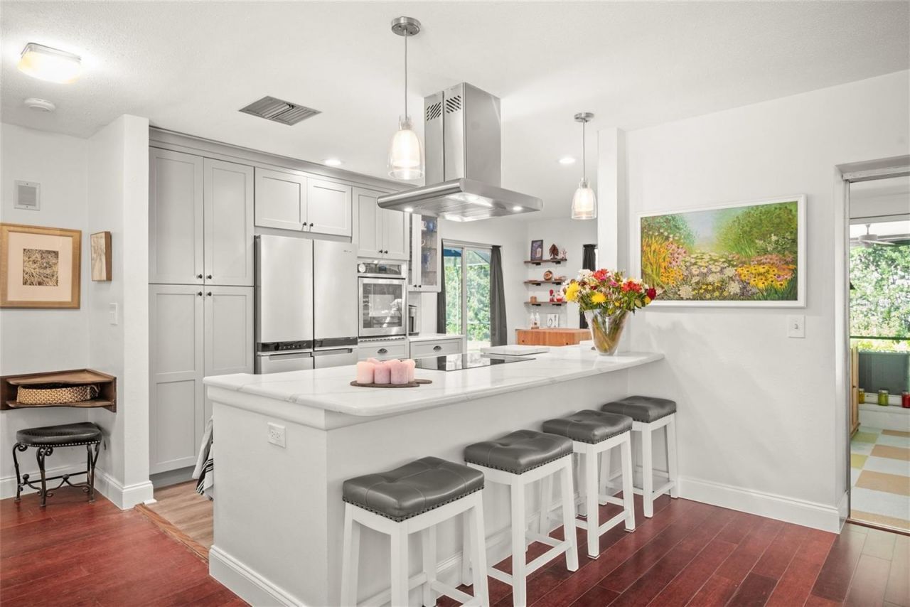 SUPER SPACIOUS, Luxury Pool Home w/ 2 MASTER suites + Extended Glassed in Florida rm + Detached HEATED/COOLED FLEX SPACE/HOME OFFICE. In addition present dining could be configured as 3rd bdrm! This Open concept home feels MUCH larger than actual square footage! Every detail of this thoughtfully curated, floor plan invites you to relax, entertain, and live beautifully! The outdoor living experience is nothing short of spectacular. A designer resort-style, 8 year NEW, salt water screened pool, is surrounded by custom pavers and framed by spacious yard space (over 1/4 acre lot) with fully fenced, lush podocarpus hedging that creates a private tropical sanctuary. An impressive entertainment bar with a built-in gas grill makes alfresco dining and poolside gatherings both stylish and seamless. Adding remarkable versatility to the property is the stunning 'Little House-a custom-designed, FLEX space featuring its own HVAC system, transom windows, loft storage and an inviting front porch. Ideal as a sophisticated home office, guest retreat, artist studio, or future in-law suite. Inside, the residence showcases a desirable open-concept split floor plan with two generously sized primary-style bedroom suites, each offering its own private bath for comfort and privacy. The true centerpiece of the home is the magnificent chef's kitchen, recently reimagined with a dramatic quartz island, custom cabinetry, and top-of-the-line appliances-perfect for culinary enthusiasts and entertainers alike. The expansive living room flows effortlessly into a fully enclosed porch, (could easily be heated and cooled to add additional square footage!) Beyond this is a screened lounge space that opens to the sparkling pool, creating an extraordinary indoor-outdoor lifestyle ideal for hosting memorable gatherings. Additional features include a newer central A/C system with updated ductwork, a durable tile roof, and side-yard space with reinforced steel gates - perfectly suited for a boat or camper + plenty of room for kids, pets or a fire-pit! In addition, the circle neighborhood is safe and quiet for morning strolls! All of this is located in NON-FLOOD ZONE X just 1.5 miles from the beach, placing coastal living within easy reach. This is more than a home-COME, LET INSPIRATION SETTLE IN!